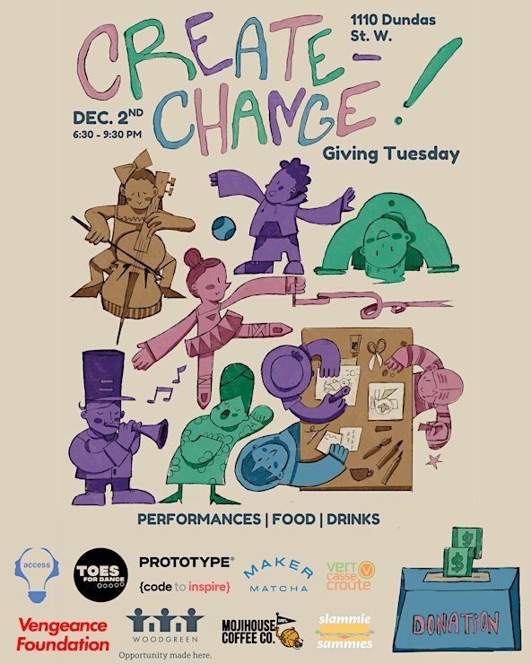 On Tuesday, December 2 (6:30–9:30 PM), in partnership with Vengeance Foundation, we are hosting Create/Change: Toronto’s GivingTuesday Collab at Youthful Vengeance, bringing together Toronto’s arts and nonprofit communities for an evening of creativity and collective impact.